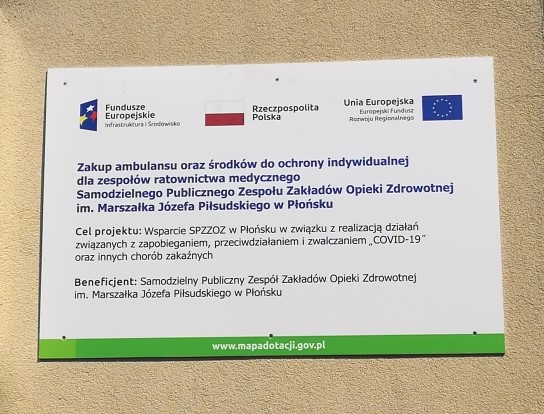 W kwietniu 2021 r. Samodzielny Publiczny Zespół Zakładów Opieki Zdrowotnej im. Marszałka Józefa Piłsudskiego w Płońsku podpisał z Ministerstwem Zdrowia (MZ) umowę o dofinansowanie projektu pn. „Zakup ambulansu oraz środków do ochrony indywidualnej dla zespołów ratownictwa medycznego SPZZOZ w Płońsku” na kwotę 520 000,00 zł.